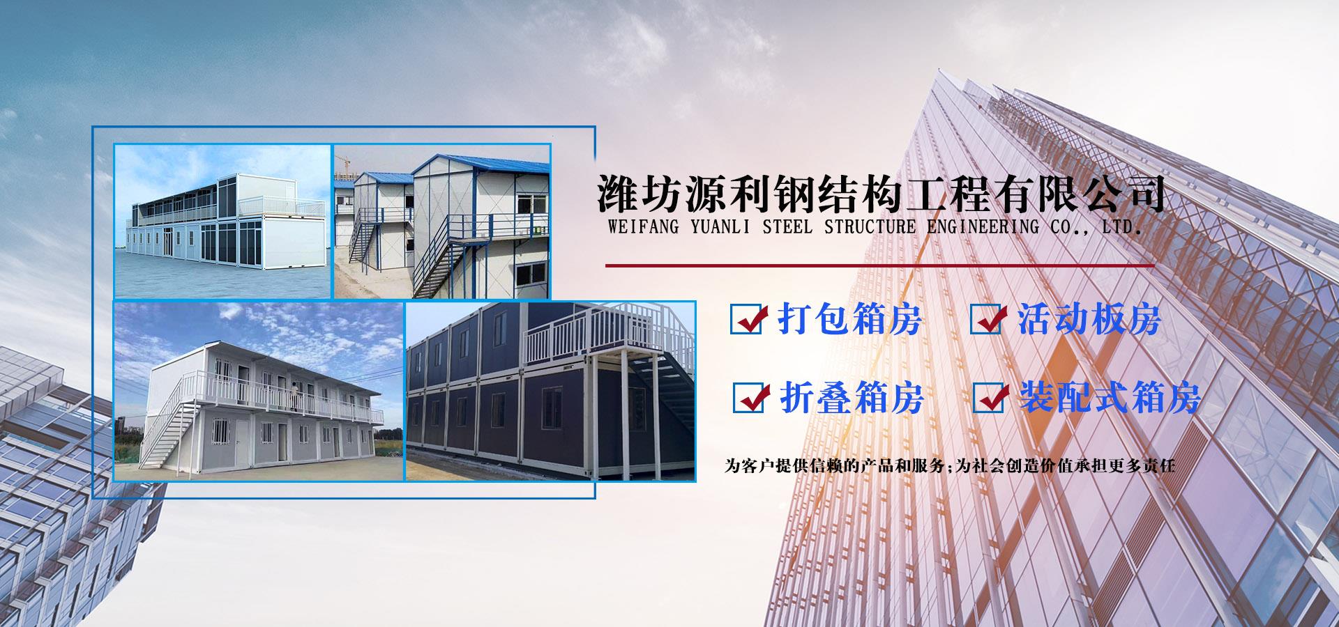 濰坊源利鋼結構工程有限公司成立于2015年,是一家從事活動房屋,鋼結構設計、制作、安裝為一體的公司。公司坐落于風景秀麗的藍寶石之鄉昌樂開發(fā)區,占地約60畝,年加工生產能力到40萬平米,現已發(fā)展成本地較大的鋼結構企業,同時也已跨入集成房屋研發(fā)、推廣企業行列。公司配備了全套的箱房流水線生產設備,包含了全自動冷彎成型設備、流水自動涂裝線、沖壓型材生產線以及全套的配套設備,標準化、模具化生產加工,年生產5000套打包箱,產品保障。 公司主要產品有:鋼結構工程加工、制作、安裝;各類活動板房、打包箱房、裝配式箱房、折疊箱房、圍擋、料棚、異型H型鋼、屋面板、墻面板、樓承板,C型鋼,Z型鋼;馬路隔離護欄等相關產品。